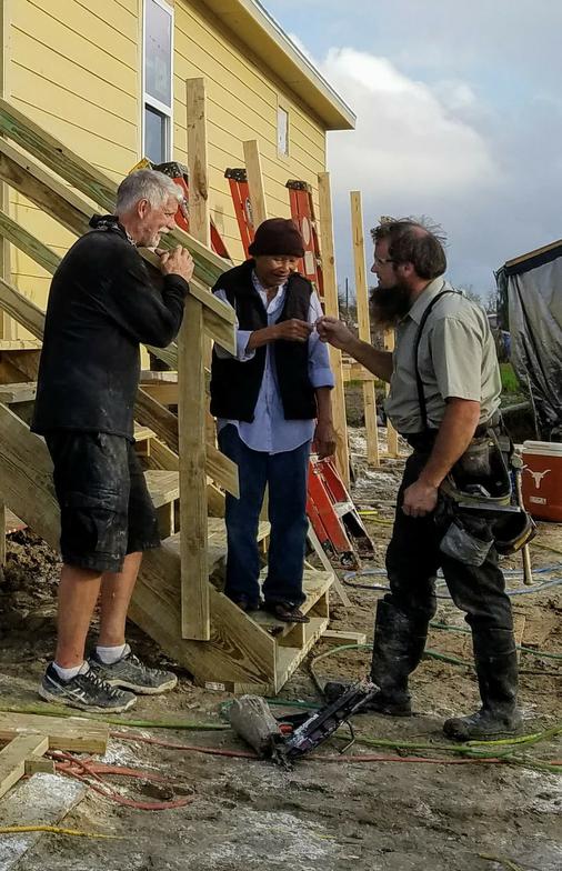 In the months following the devastating flood waters of Hurricane Harvey, our teams built 18 homes for families, whose homes in Brazoria County had been destroyed. The first home was a "tiny house" for an elderly couple who, since losing their home in the flood, had been living under a tarp. All that remained of their home was the toilet, which they wrapped a tarp around and still used as their bathroom. We were joined by volunteers from all over the country. Here is a picture of a volunteer from the Mennonite community presenting the couple with the keys to their new home.